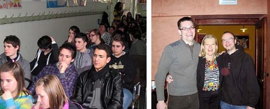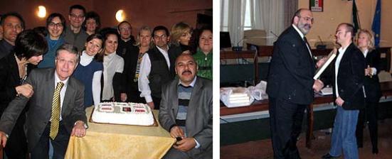 (links: Beim Empfang in der Schule; rechts: Maestra Donatelle Iezzi und die Lehrkräfte der dt. Gruppe - T. Wernthaler und G. Wiedekind)