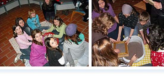 Gleich nach dem Frühstück liefen wir zum Kloster, wo wir Papier schöpften. Wir zerrissen alte Zeitungen und vermischten die Stücke mit viel warmem Wasser. Das geschöpfte Papier verzierten wir mit bunten Fäden und legten es dann zum Pressen und schließlich zum Trocknen aus. Nun ging es zum Zug, denn anschließend gingen wir Schwimmen. Das Schwimmbad Trimini in Kochel am See war unser Ziel. Dort hatten wir einen riesen Spaß, besonders auf den Rutschen und im Außenbecken.