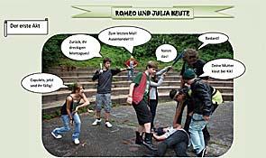 Bei der Besprechung der Lektüre stand die Frage im Vordergrund, inwieweit die Geschichte der tragischen Liebe zwischen den beiden Jugendlichen zwei verfeindeter Familien heute noch aktuell ist. Mittels einer Foto-Lovestory, die Schülern aus Jugendzeitschriften wie „BRAVO“ bekannt ist, wurden die gesammelten Ideen durch Fotos, Untertexten und Sprechblasen umgesetzt. Dabei wurden z. T. Originalnamen der Figuren des Dramas verändert, geeignete Kulissen im Schulhaus und Schulgelände ausgewählt und die Sprache Shakespeares durch Jugendsprache ersetzt. Der Hauptunterschied zum Originaldrama besteht darin, dass die Capulets und Montagues im Fotoroman Punker- bzw. Skatergangs darstellen. Der Inhalt der Liebesgeschichte, die tödlich endet, bleibt dennoch erhalten.