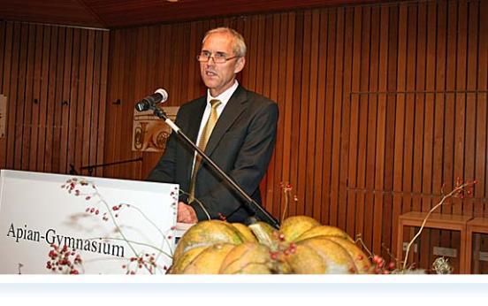 Anderseits betont er die große Aufgabe, die sich damit für den neuen Direktor des Apian - Gymnasiums stellt. In dem Bild, der Schule ein Gesicht geben und ihren Geist nachspüren, veranschaulicht er dies. So sei es Aufgabe sowohl das innere Gesicht der Schule als auch das äußere zu prägen. Während der Schulleiter vor allem das innere Gesicht forme, sei es Aufgabe der Stadt, sich um das äußere zu kümmern. Das beides auch zusammenwirkt, verdeutlicht der Oberbürgermeister in einem Zitat von Winston Churchill "Zuerst formt der Mensch das Gebäude, dann formt das Gebäude den Menschen."