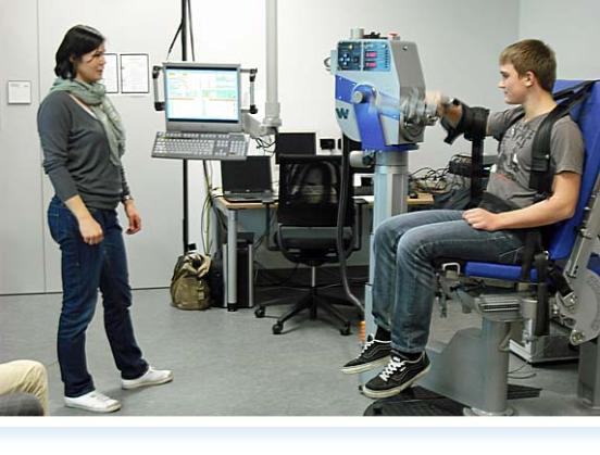 Nach der Mahlzeit wurden wir vor einem anderen Gebäude von Frau Julia Zandt, die gerade ihre Doktorarbeit am Lehrstuhl für Biomechanik schreibt, empfangen. Sie hat uns dann alle Labore der verschiedenen Bereiche gezeigt. Da sie gerade eine Studie zum Thema Prävention bei Überkopf-Schlagwurfbewegungen mit Außenrotationsbewegungen fertig gestellt und schon teilweise veröffentlicht hat, haben wir darüber sehr genaue Informationen bekommen.