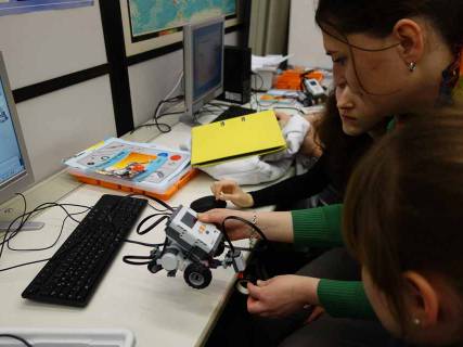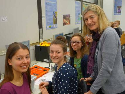 Einige Schülerinnen hatten viel Spaß dabei, unter Anleitung von Frau Hadinger und Frau Bauer (THI) Roboter so zu programmieren, dass sie verschiedene, teils auch schwierige, vorgegebene Raumwege abfuhren. Nicht immer funktionierte dies auf Anhieb, aber aus Fehlern lernt man und zuletzt verließen doch alle Schülerinnen dieses Workshops den Computerraum mit dem Erfolgserlebnis, die Roboter auf den richtigen Weg (egal ob kurvig oder gerade) gebracht zu haben.