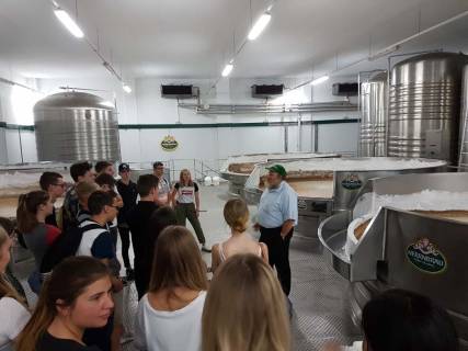 Wie gewohnt gab Herr Dotzauer von der Brauerei Herrnbräu auf seine unnachahmliche Art und Weise einen interessanten Überblick über das Brauwesen in Ingolstadt, bevor er gekonnt durch die Anlage führte. Heuer hatten unsere Schüler ganz besonderes Glück. Da die Produktion gerade in allen Teilabschnitten auf Hochtouren lief konnten die Schüler die Bierproduktion neben den optischen Eindrücken mit fast allen weiteren Sinnen miterleben: Vom charakteristischen Geruch obergärigen Bieres während des Gärvorgangs über die Temperaturunterschiede zwischen Sud- und Lagerraum bis hin zur ohrenbetäubenden Lautstärke der Abfüllanlagen. Bierherstellung spricht alle Sinne an! Einzig der Geschmackstest muss bei einer Schulveranstaltung außen vor bleiben. Stattdessen wurden wir von Herrnbräu bestens mit den hauseigenen Limonaden und Brezen versorgt.