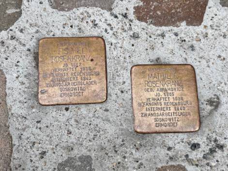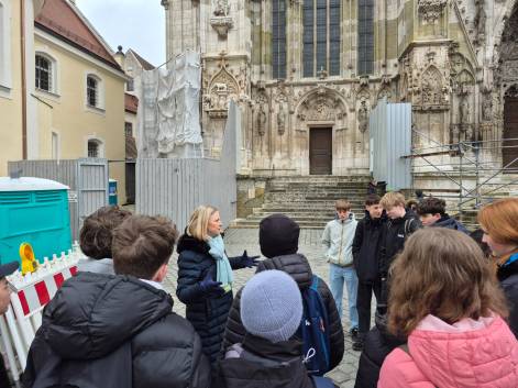 Bei der anschließenden Stadtführung erfuhren die Jugendlichen mehr über das jüdische Leben im mittelalterlichen Regensburg. Besonders im Gedächtnis blieben dabei alte jüdische Grabsteine in Hausfassaden sowie die Stolpersteine, die an die Opfer des Nationalsozialismus erinnern.